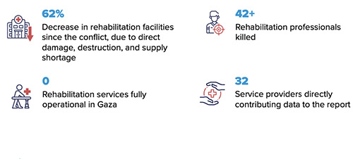 The conflict has devastated the rehabilitation workforce. Gaza once had around 1300 physiotherapists and 400 occupational therapists, but many have been displaced, and at least 42 had been killed as of September 2024, according to the report. Today, one rehabilitation health worker was reportedly killed and one injured, along with two other health workers in the same attack. Those providing care are experiencing extreme stress and suffering. Despite the huge number of amputations, Gaza has only 8 prosthetists to manufacture and fit artificial limbs.