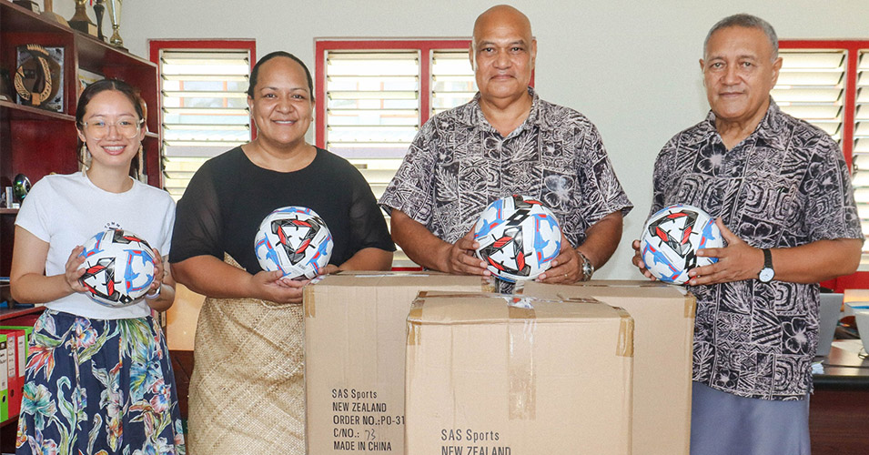 Lord Ve’ehala, President of the Tonga Football Association, and General Secretary Lui ‘Aho received an equipment grant of 160 footballs from TASANOC CEO Netina Vea and Australian volunteer Yi Yi.