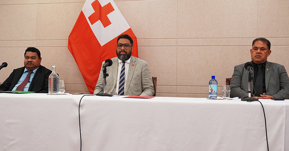 Prime Minister Lord Fakafanua (centre) with Finance Minister, Hon. Lataifaingata'a Tangimana (left) and Deputy PM Hon. Dr Viliami Latu. Media briefing. Nuku'alofa. 27 February 2026. Photo: Matangi Tonga.