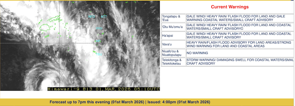 Forecast and advisories from Tonga Meteorological Services. Issued Time: 5:00pm Sunday 01st March 2026: