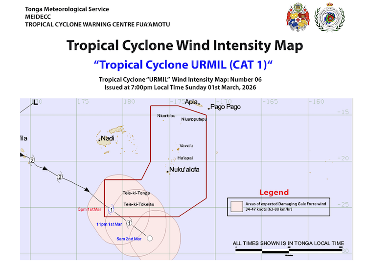 Tropical Cyclone Urmil (Cat, 2) passing through the coastal waters of Tele-ki-Tonga and Tele-ki-Tokelau today, is expected to move out of Tonga's maritime boundary by later tonight.
