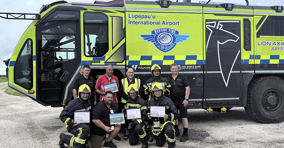A new Cat 5 ARFF vehicle for Lupepau'u Airport was handed over on 16 March 2026. TCRTPII team with Aviation Fire Services Ltd. Photo: TCRTP II.