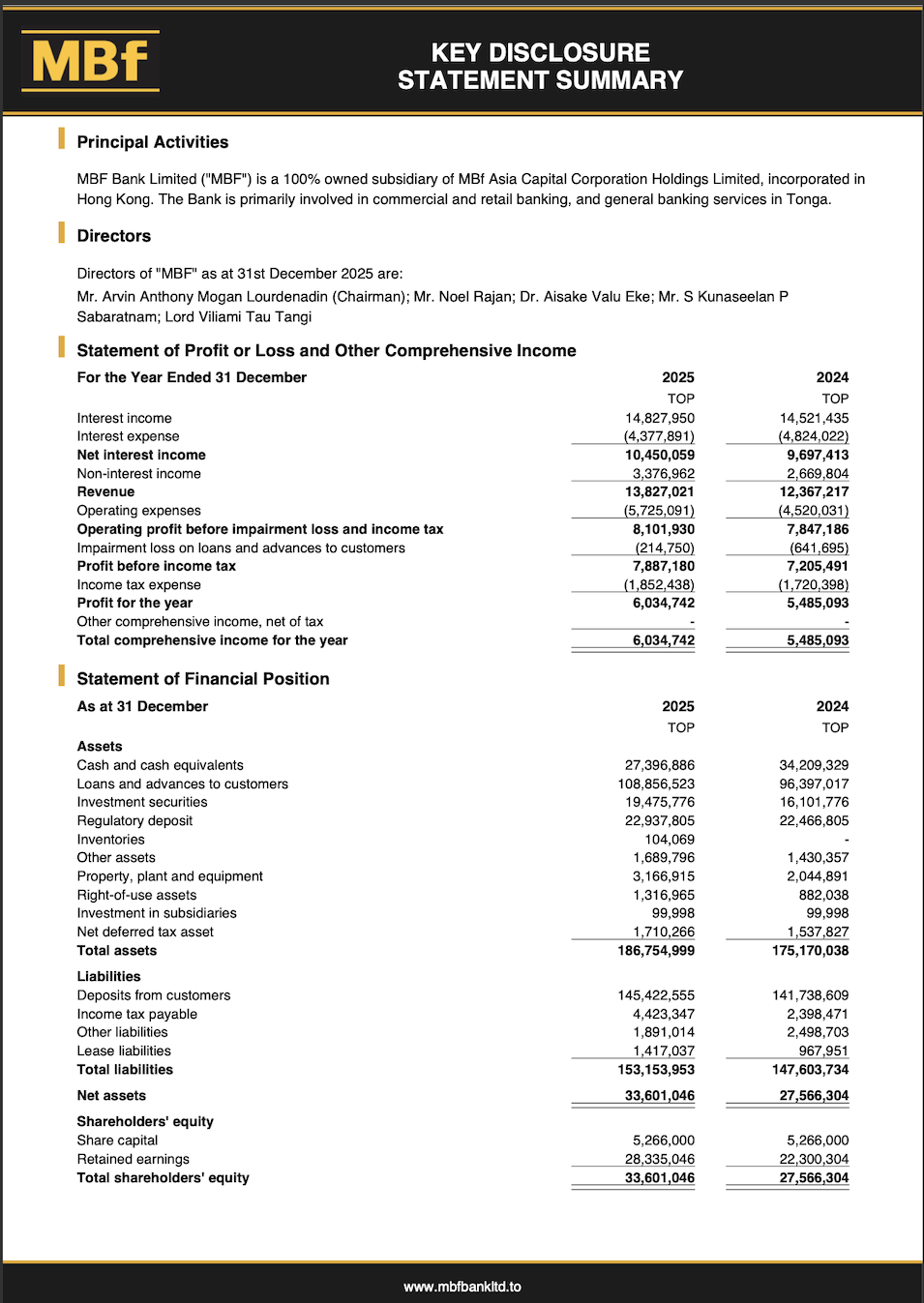 Despite a challenging global economic environment, MBF Bank recorded a 10.0% increase in net profit after tax to TOP 6.0 million, driven by lending growth, improved operational efficiencies, and rising digital adoption. Total assets increased by 6.6% to TOP 186.8 million, while the Bank maintained capital levels well above regulatory requirements, reinforcing its financial strength and stability.