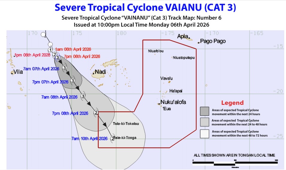 Severe TC VAIANU (CAT 3) was located near latitude 15.9 south and longitude 173.4 east or about 295km west northwest of Suva, Fiji, 1175km west of Niuafo’ou, 1370km west of Niuatoputapu, 1375km west northwest of Neiafu, Vava’u, 1365km west northwest of Pangai, Ha’apai, 1335km west northwest of Nuku’alofa at 7:00pm 6 April, 2026.