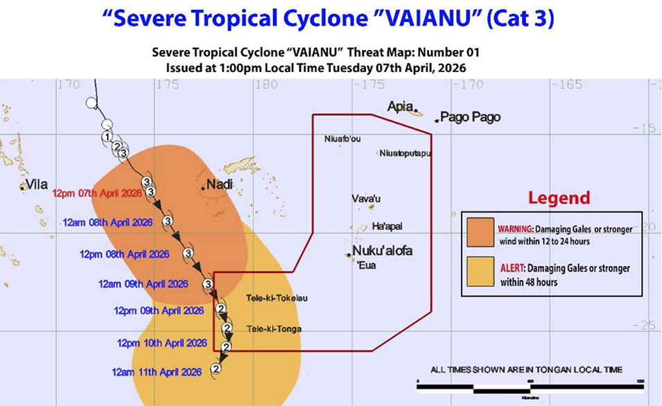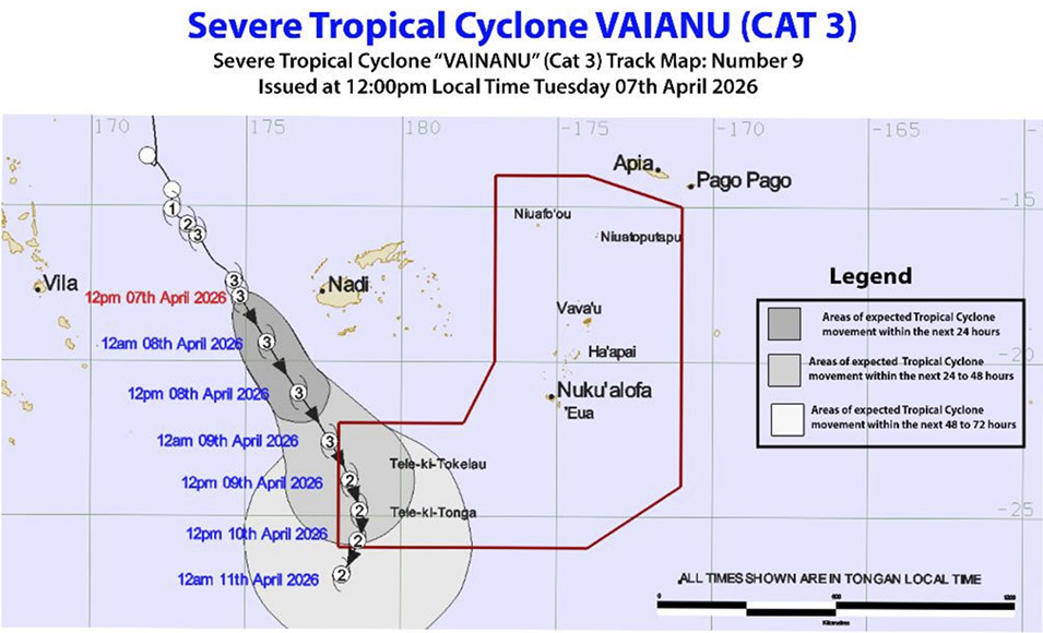 Severe Tropical Cyclone Vaianu (CAT 3) was located near latitude 17.9 South and longitude 174.8 east or about 385km west of Suva, Fiji, 1115km West northwest of Nuku’alofa or 1145km west northwest of ‘Ohonua, ‘Eua at 12:00pm this afternoon, 7 April 2026.