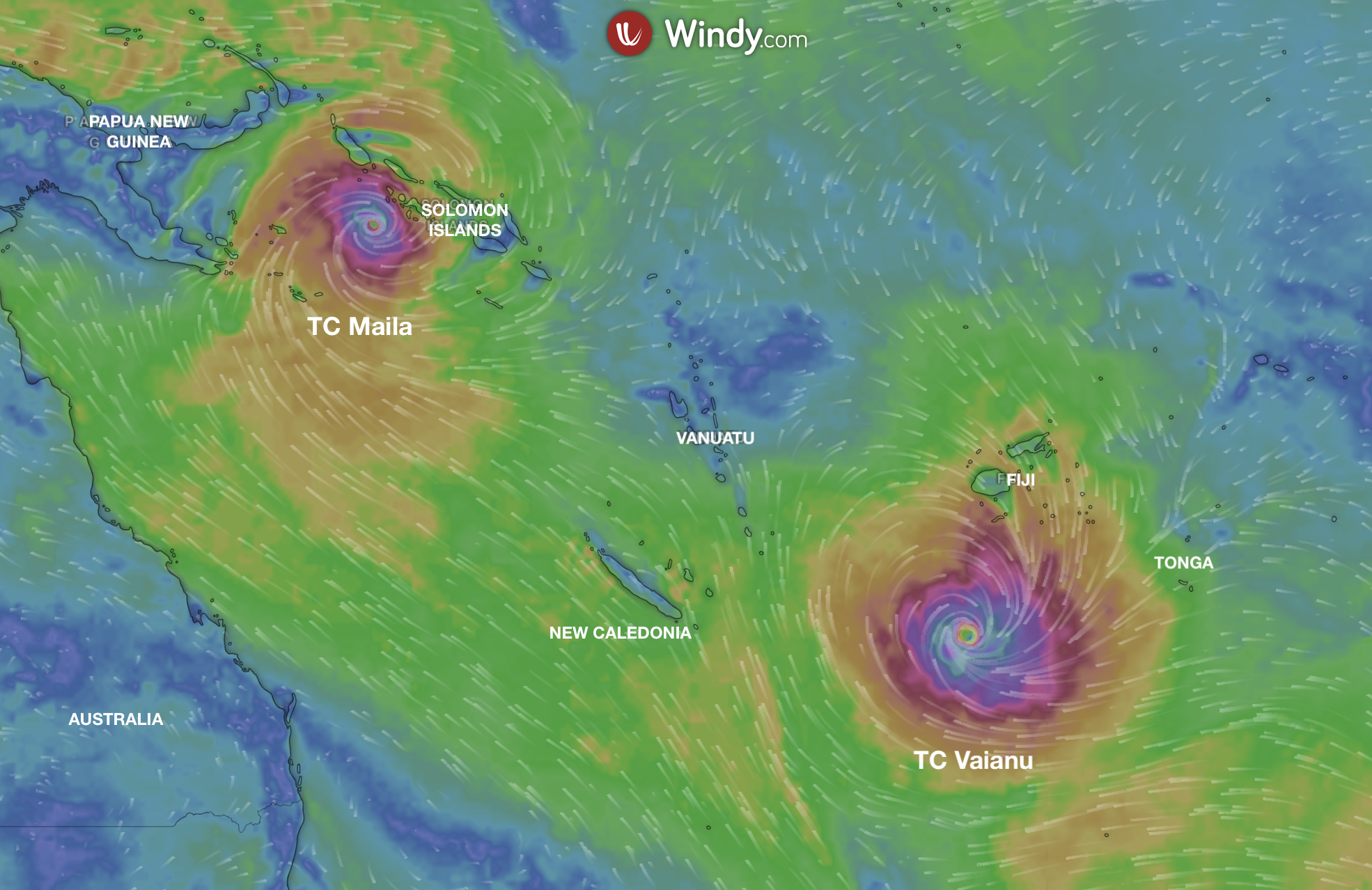 Location of Tropical Cyclones Maila and Vaianu in the Pacific Islands, afternoon Wednesday 8 April, 2026. Image: windy-dot-com