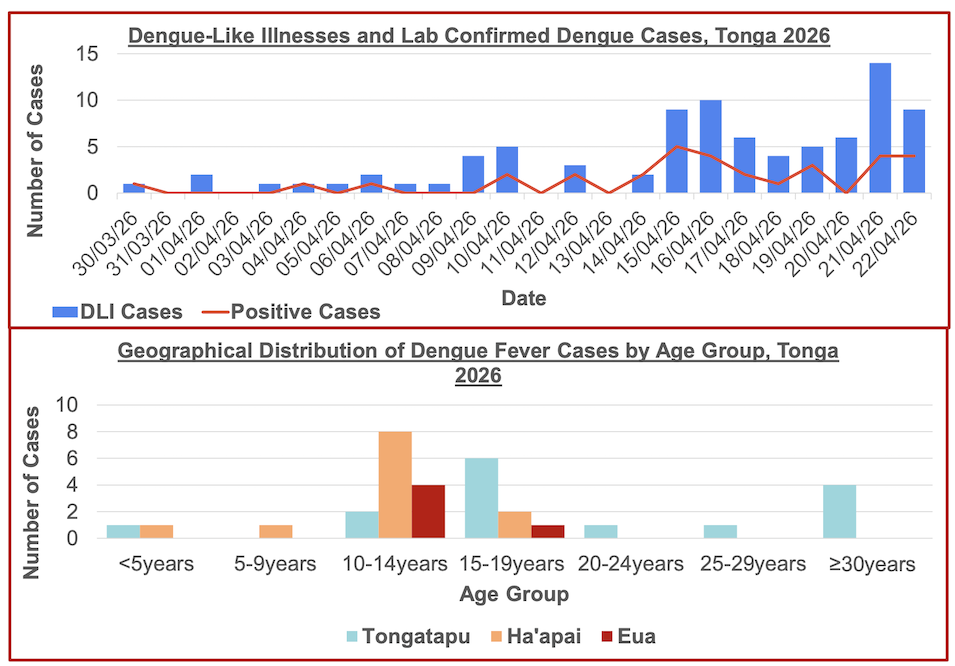 A total of 32 cases of dengue fever have been confirmed across Tonga - an increase of 4 cases since the last report, the Ministry of Health reported today (Sit rep#5) 23 April 2026. Seven cases are currently hospitalised including five in Ha'apai and two in Tongatapu.
