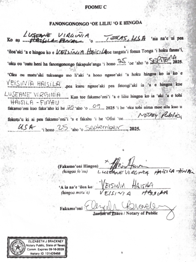 LUSEANE VIRGINIA HAISILA FINAU Formerly: Veisinia Haisila of Texas, USA |