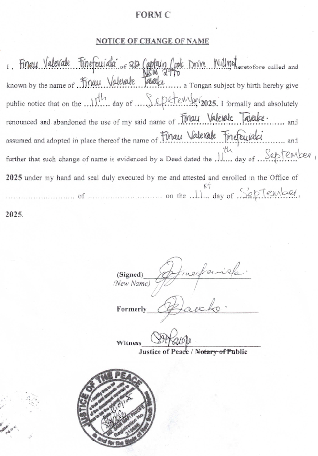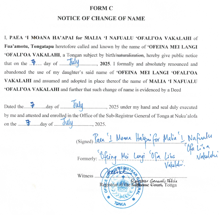 The Registrar General has approved the publication of a Notice of Change of Name (Form C of the First Schedule to the Registrar General’s (Change of Name) Regulations), required by regulation 9, in the Matangi Tonga website and the Kele’a newspaper. - Ministry of Justice, Government of Tonga. |