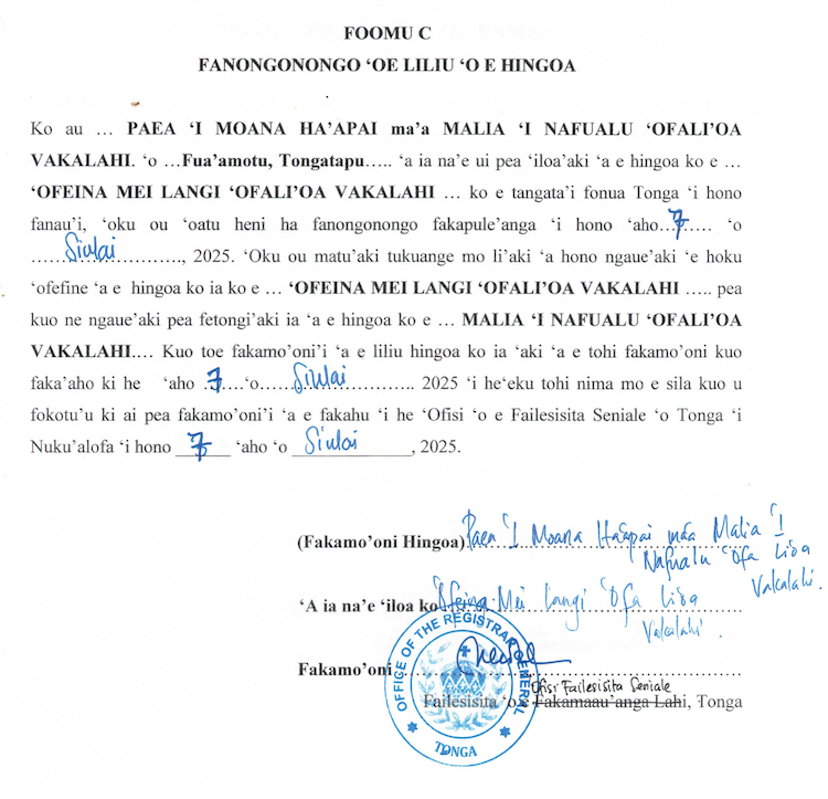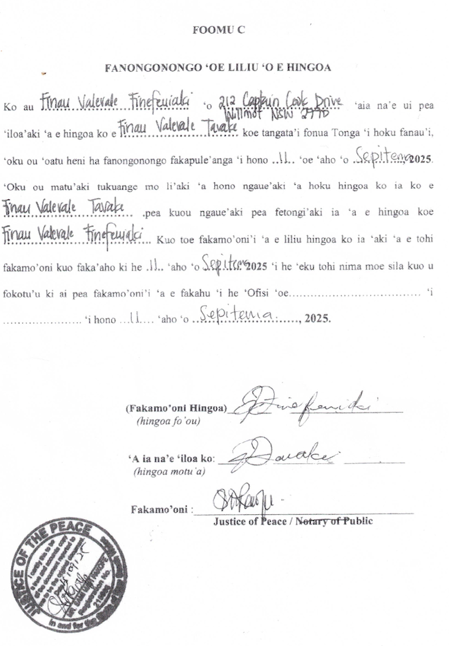 Kuo tali ‘e he Failesisita Seniale ke pulusi ha Fanongonongo ‘o e Liliu Hingoa (Foomu C ‘o e Tepile ‘Uluaki ki he Ngaahi Tu’utu’uni (Liliu ‘o e Hingoa) ‘a e Failesisita Seniale, ‘oku tu’utu’uni ‘e he tu’utu’uni 9, ‘i he uepisaiti ‘a e Matangi Tonga mo e nusipepa Kele’a. - Potungaue Fakamaau‘anga, Tonga. |
