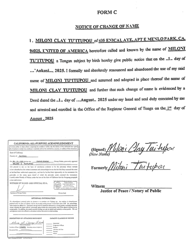 MILONI CLAY TU’ITUPOU Formerly: Miloni Tu’itupou of Menlo Park, CA. United States. |