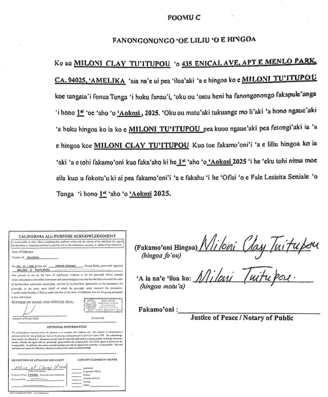 Kuo tali ‘e he Failesisita Seniale ke pulusi ha Fanongonongo ‘o e Liliu Hingoa (Foomu C ‘o e Tepile ‘Uluaki ki he Ngaahi Tu’utu’uni (Liliu ‘o e Hingoa) ‘a e Failesisita Seniale, ‘oku tu’utu’uni ‘e he tu’utu’uni 9, ‘i he uepisaiti ‘a e Matangi Tonga mo e nusipepa Kele’a. - Potungaue Fakamaau‘anga, Tonga. |