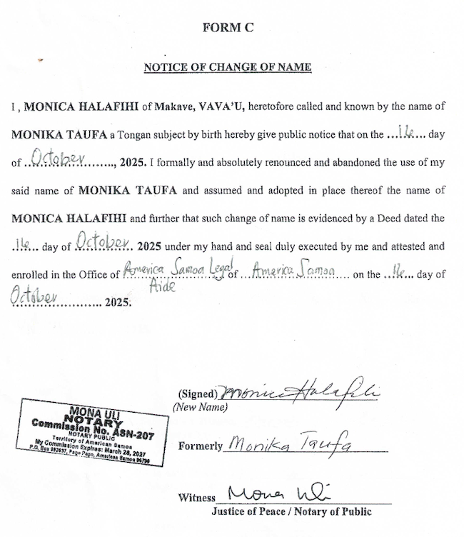 The Registrar General has approved the publication of a Notice of Change of Name (Form C of the First Schedule to the Registrar General’s (Change of Name) Regulations), required by regulation 9, in the Matangi Tonga website and the Kele’a newspaper. - Ministry of Justice, Government of Tonga. |