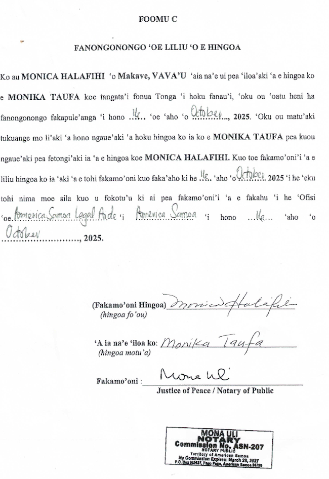 Kuo tali ‘e he Failesisita Seniale ke pulusi ha Fanongonongo ‘o e Liliu Hingoa (Foomu C ‘o e Tepile ‘Uluaki ki he Ngaahi Tu’utu’uni (Liliu ‘o e Hingoa) ‘a e Failesisita Seniale, ‘oku tu’utu’uni ‘e he tu’utu’uni 9, ‘i he uepisaiti ‘a e Matangi Tonga mo e nusipepa Kele’a. - Potungaue Fakamaau‘anga, Tonga. |