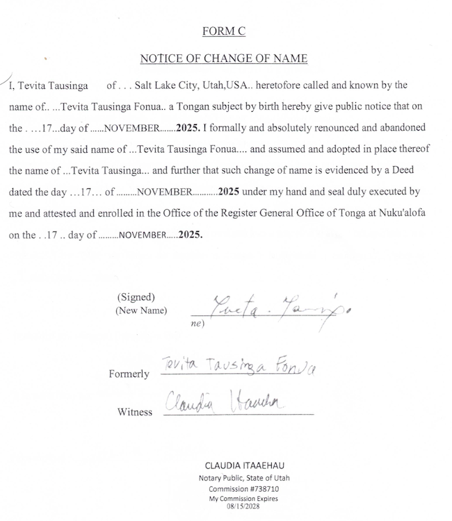TEVITA TAUSINGA Formerly: Tevita Tausinga Fonua of Salt Lake City, Utah, USA. |
