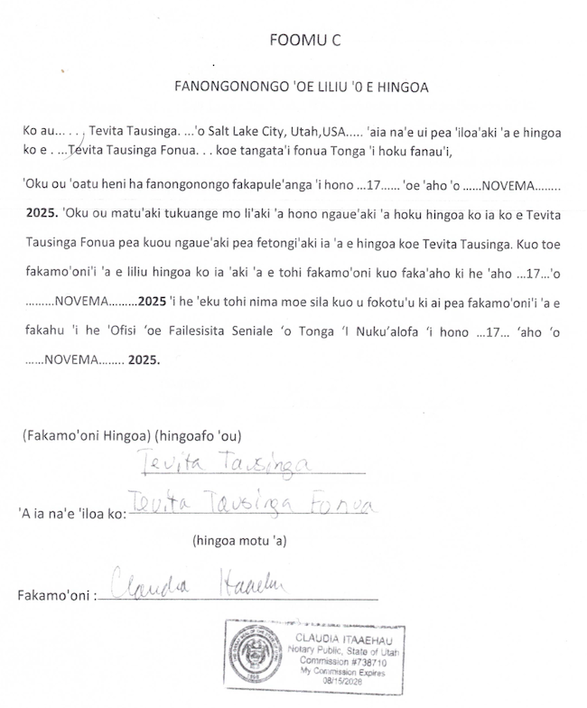 Kuo tali ‘e he Failesisita Seniale ke pulusi ha Fanongonongo ‘o e Liliu Hingoa (Foomu C ‘o e Tepile ‘Uluaki ki he Ngaahi Tu’utu’uni (Liliu ‘o e Hingoa) ‘a e Failesisita Seniale, ‘oku tu’utu’uni ‘e he tu’utu’uni 9, ‘i he uepisaiti ‘a e Matangi Tonga mo e nusipepa Kele’a. - Potungaue Fakamaau‘anga, Tonga. |